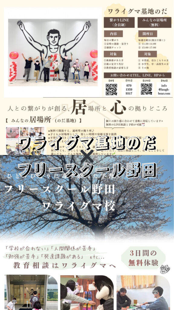 本記事は、千葉県野田市で無料で利用できる子どもの居場所・教育相談場所「ワライグマ基地のだ」、またフリースクール「ワライグマ校」を運営するLaugh Bearの代表(小林通雄)が作成しております。